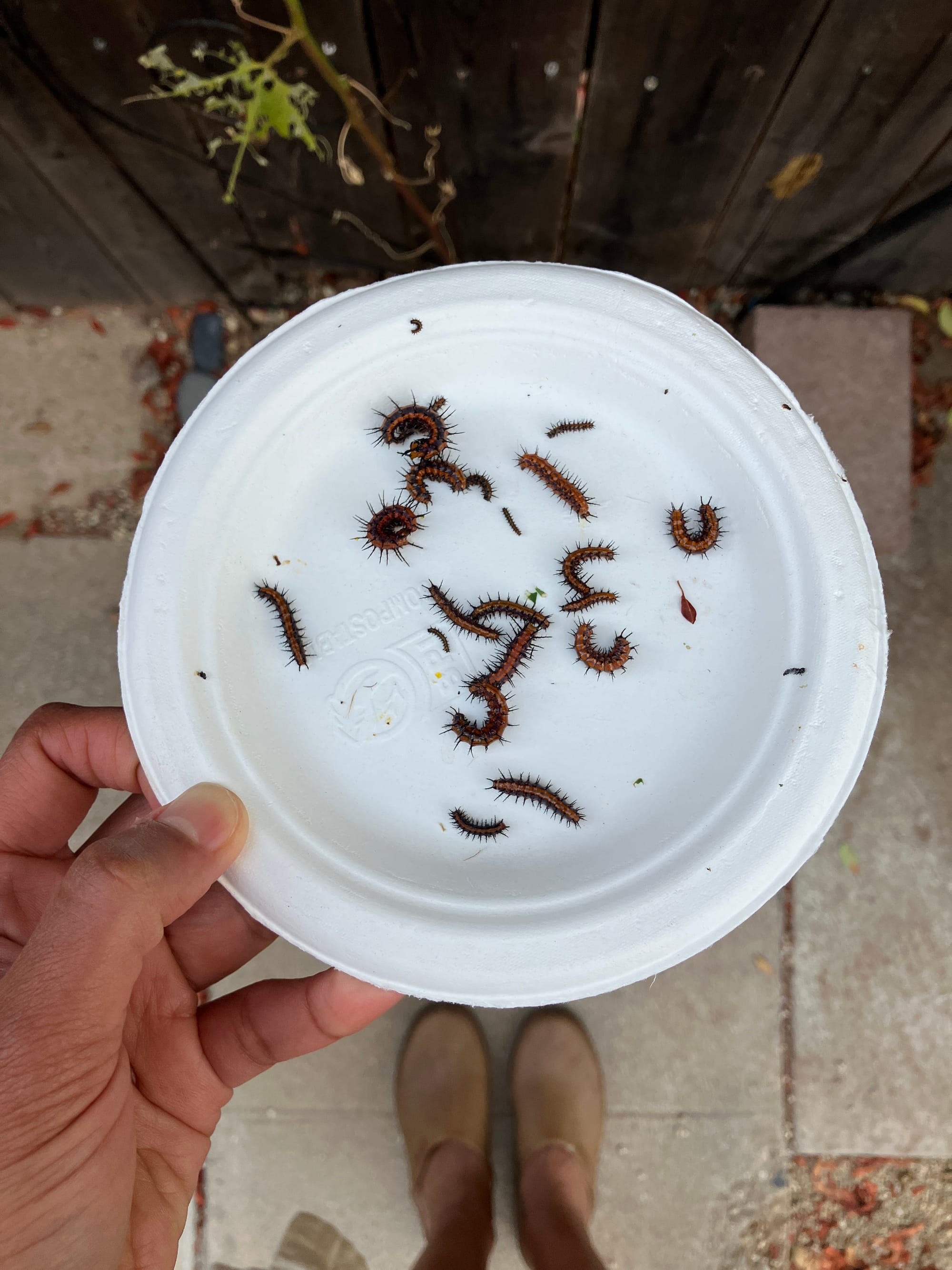 Growing the vine has been equal parts joy and chaos. A joy because it’s lent green abundance to a musty fence and blank stucco wall. Chaotic because gulf fritillary caterpillars are eating the leaves with gusto. The way Monarch caterpillars eat milkweed, gulf fritillary caterpillars eat passionflower pretty much exclusively. It’s their food, and I can respect that, but damn, leave some for me.