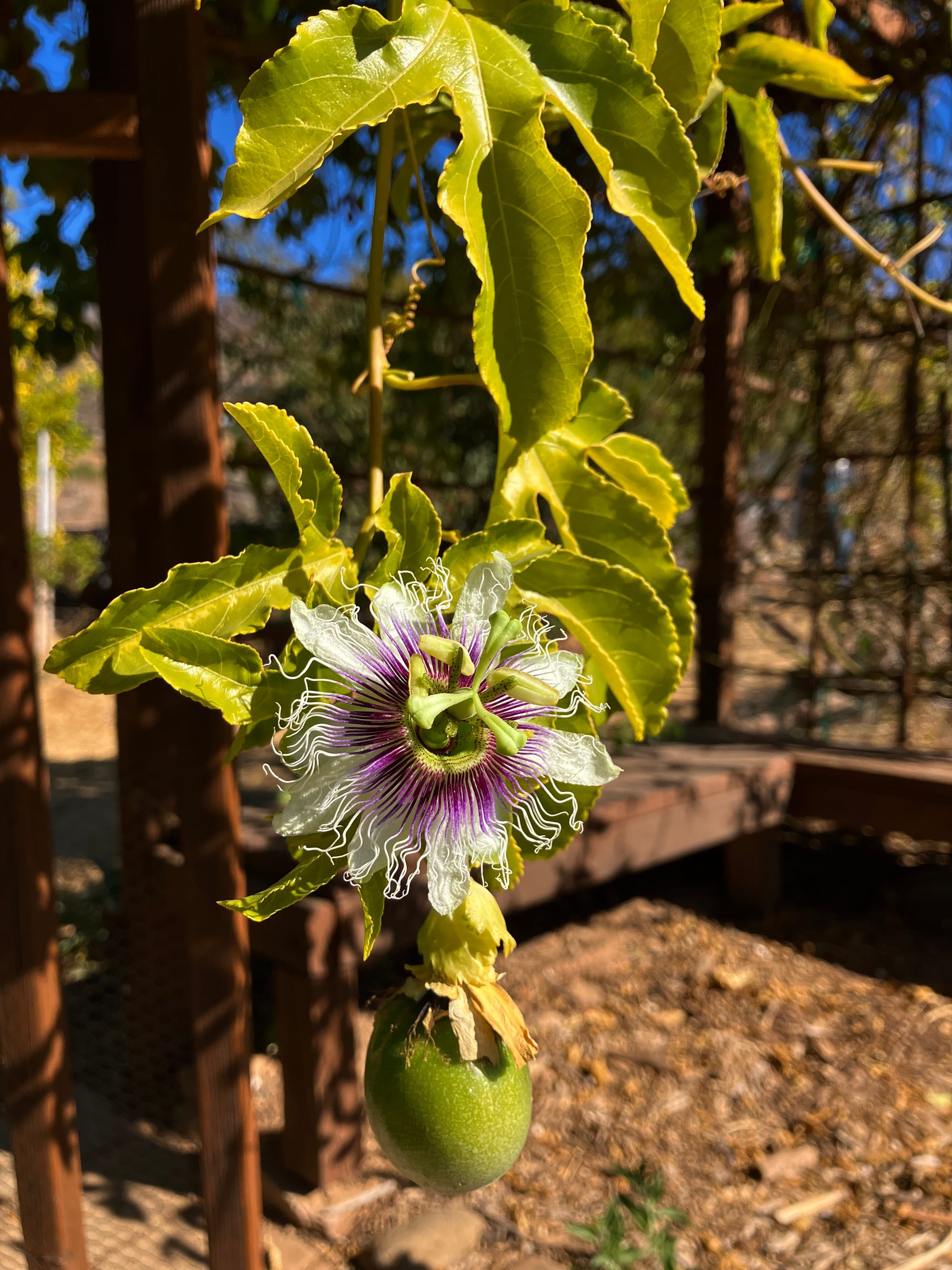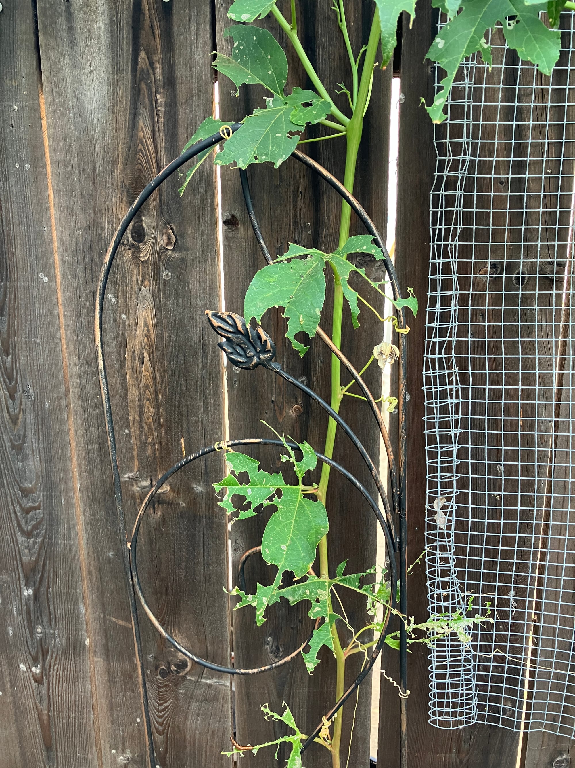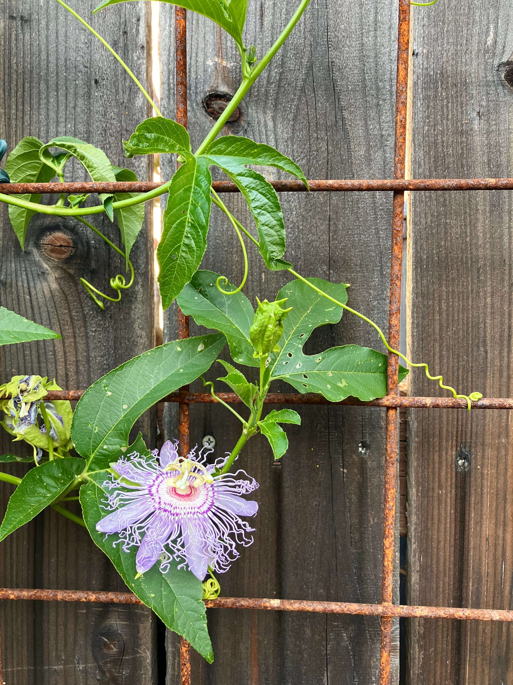 Passionflower grows incredibly fast with the help of tendrils, thin stems that grab onto fences, pergolas, other plants and even their own leaves. Like those of peas or cucumbers, tendrils provide structure, support and some height advantage for resources. Sometimes in spot where a tendril has nothing to hold onto, it’ll just coil mid-air. It’s pretty magical.